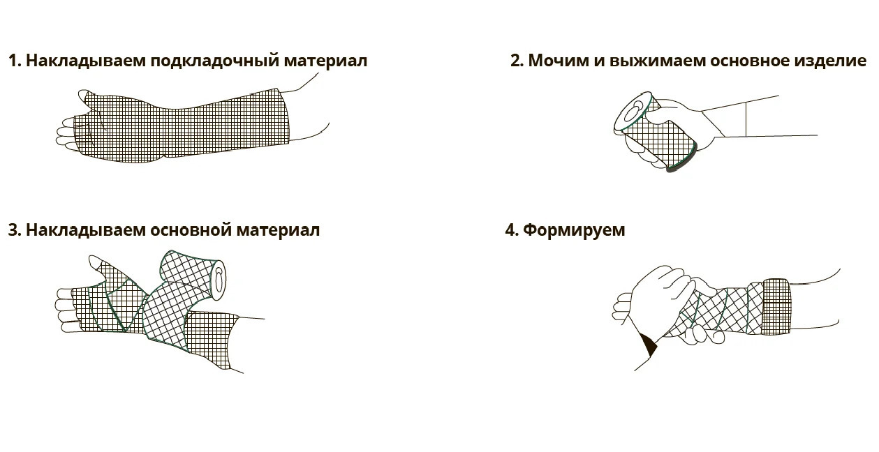 Для активации материала потребуется всего лишь немного теплой воды. После увлажнения, в течении 23 минут нанесите материал и зафиксируйте примерно на 5 минут. Полное затвердевание наступает примерно через 30 минут. Этот срок можно сократить, подсушив этот материал феном.